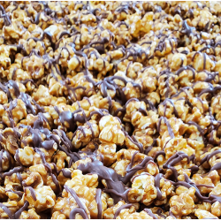 Our Old-Fashioned Caramel Corn is a buttery rich caramel made with ingredients such as butter and dark brown sugar, no powdered mixes here. We added a drizzle of milk chocolate to our Old-fashioned Caramel to create royal popcorn fit for a King.