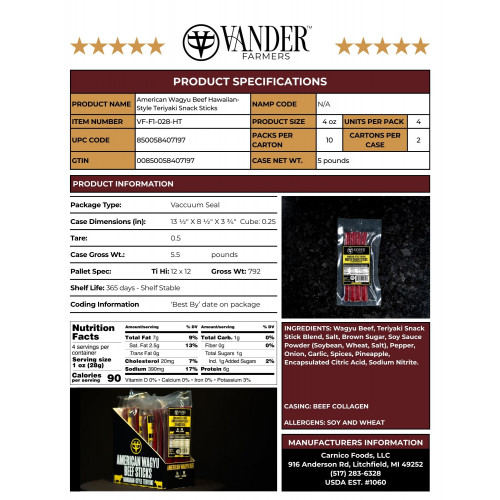 American Wagyu Beef Hawaiian Style Teriyaki Snack Sticks | 850058407197 | Sturgis Dairy LLC dba Vander Farmers | $109.00