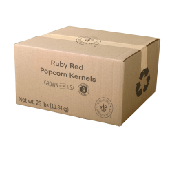 Need Dell Cove Ruby Red popcorn kernels in bulk? We've got you! These red butterfly popcorn kernels pops up fluffy and crunchy, with very few flaky hulls and a slight red tint to the center. A family favorite! Make a batch and you're ready for movie night. Our all natural premium popcorn is sustainably grown, gluten free and non-GMO, and proudly produced in Indiana by small Midwestern family farmers that are friends of ours. Sizes of bulk box options: Net Weight: 5 pounds (2.26kg) Net Weight: 25 pounds (11.33kg) These bulk box options are ideal for food service and grocery, or gourmet shops looking to sell kernels by the ounce or pound. PACKAGING INFO: Kernels are packaged in an FDA approved bulk bag that is zip-tied closed for freshness. Bag is packaged and shipped inside a double-walled corrugated cardboard box. Pallet loads are available by request. Please contact us to set up a custom order.
