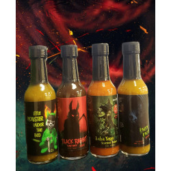 Little Monster Under the Bed Baba Yaga Knock Knock and Black Rabbit make up our Hot Sauce Series of Childhood Nightmare Monsters 4 pack! A great range of heat starting with the medium Little Monster Under the Bed up to Black Rabbit which is made with Black Garlic Black Onion and Chocolate Douglah Pepper one of the hottest peppers in the world will bring a new twist to your Hot Sauce collection! Plus you will save $10 by purchasing them as the 4 pack... and get a free 4 pack gift box! So great flavor and savings with our Childhood Nightmare Monster Series of sauces!